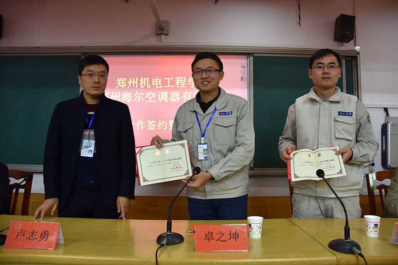 郑州海尔空调器有限公司人力资源部经理曹振威、郑州空调外机经营体负责人卓之坤,郑州机电工程学校就业办主任王洪胜、机电部部长卢志勇等领导参加签约仪式。